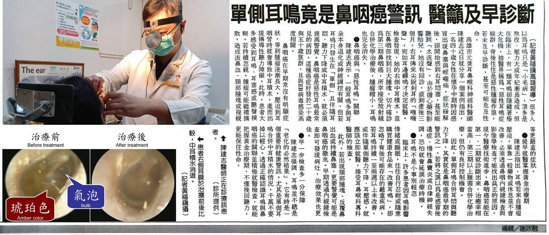 診察時,發現患者右側耳膜呈現琥珀色,並有氣泡與液面,顯示中耳積水。