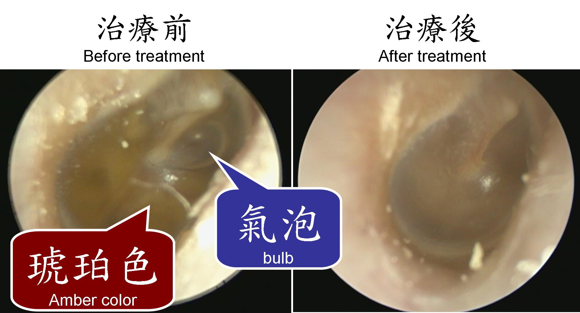 ▲ 該患者之右側耳膜,於治療前後之比較,中耳積水消退。