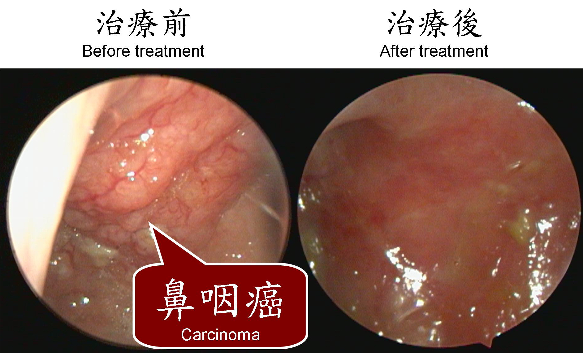 ▲該患者之鼻咽,於治療前後之比較,惡性腫瘤消失。