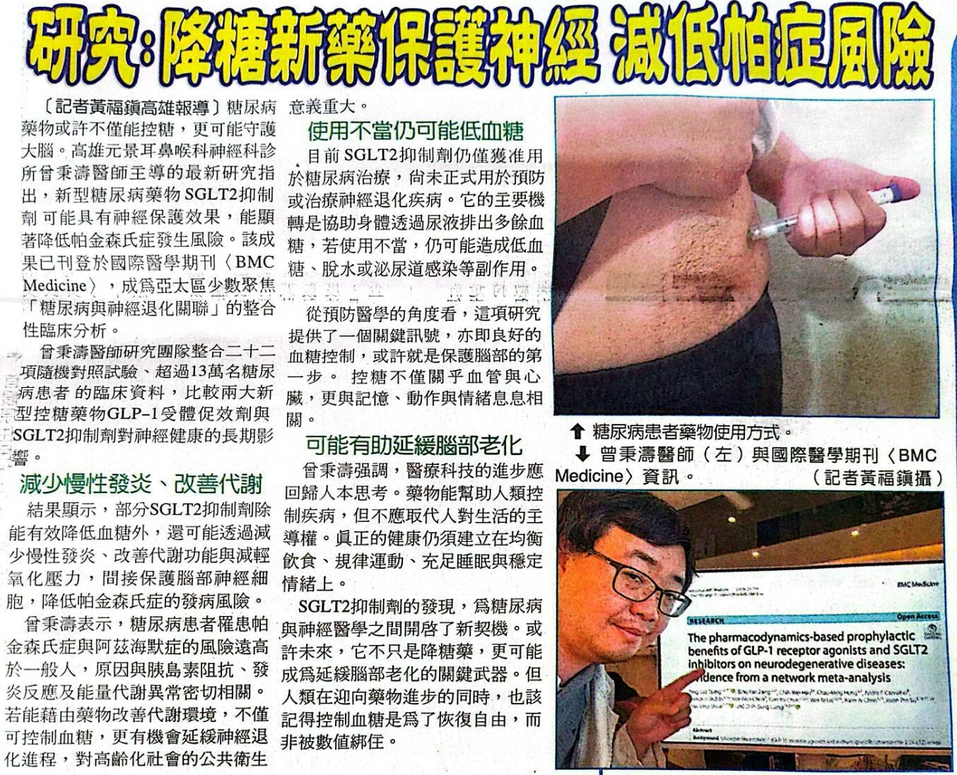 近日,由本院曾秉濤醫師(博士)主導的研究團隊,針對這個議題進行了整合性分析,研究成果已正式刊登於國際權威醫學期刊《BMC Medicine》,為亞太地區少見聚焦「糖尿病藥物與神經退化疾病關聯」的系統性研究。