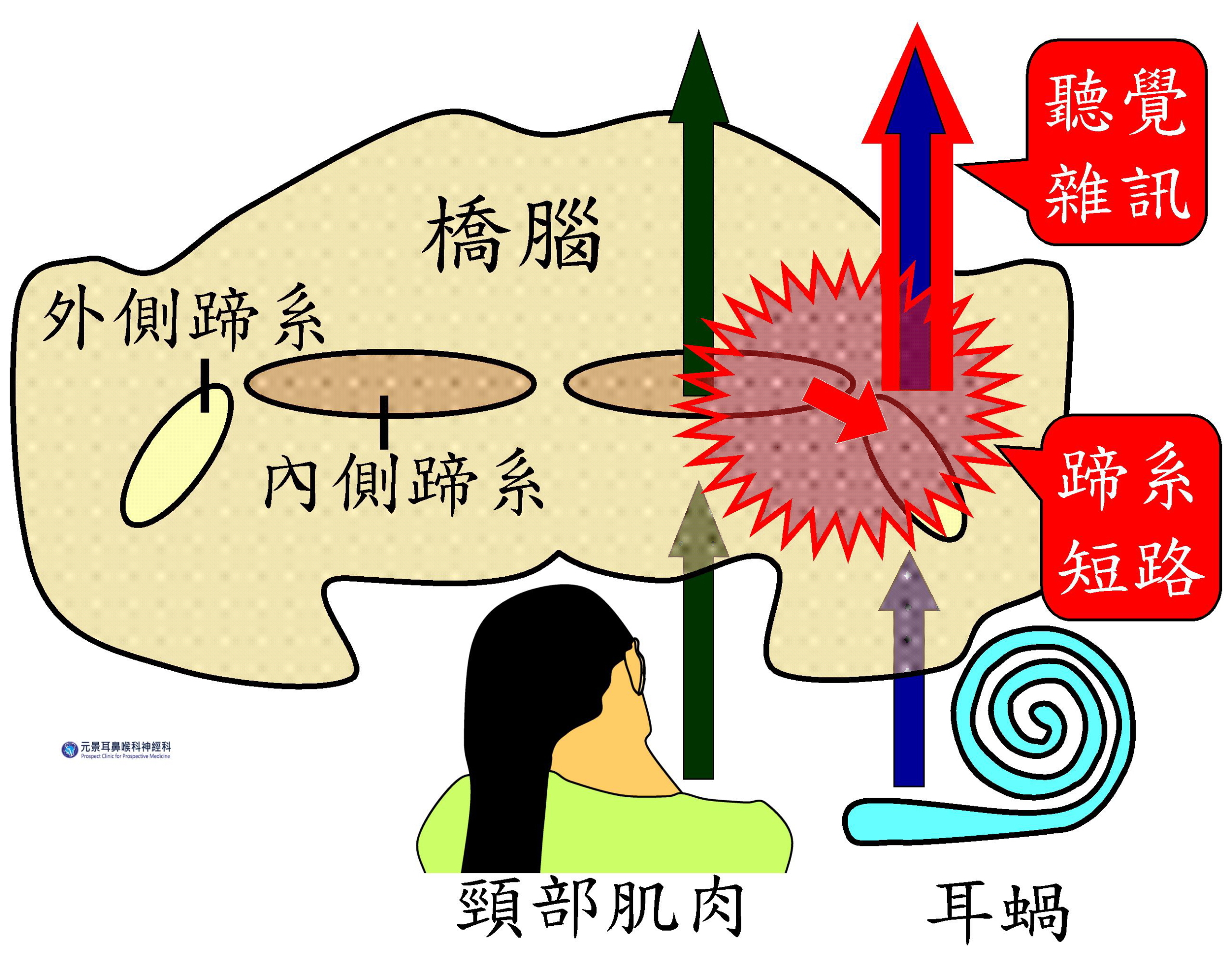 頸部肌肉長期過緊時,會刺激本體感覺神經,錯誤傳入聽覺神經系統,產生腦鳴幻音(聽起來像是「腦內響」的耳鳴)。
